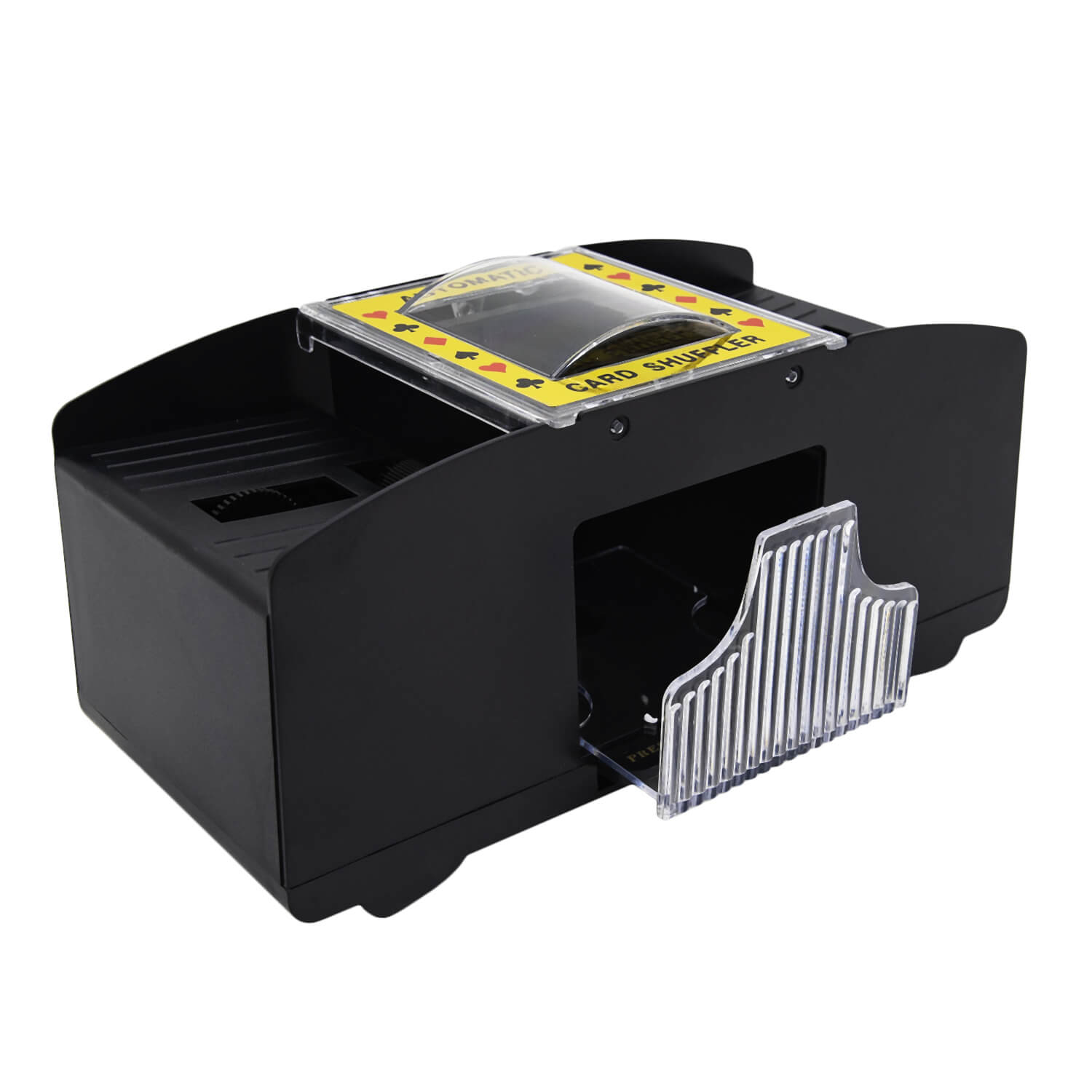 Шафл-машинка для перемешивания карт Deka подойдет для домашних карточных турниров с целью исключения шулерства. Стильная и компактная шафл машинка вмещает до двух полных колод и равномерно их размешивает без участия игроков, создавая случайное расположение карт. Помимо прямого назначения шафл машинка для карт выполняет декоративную функцию и украшает покерный стол. Машинка изготовлена из АБС пластика черного матового цвета с прозрачными вставками. Работает от четырех батареек типа АА. Машинка может использоваться как в казино, так и для домашнего использования в карточных играх.