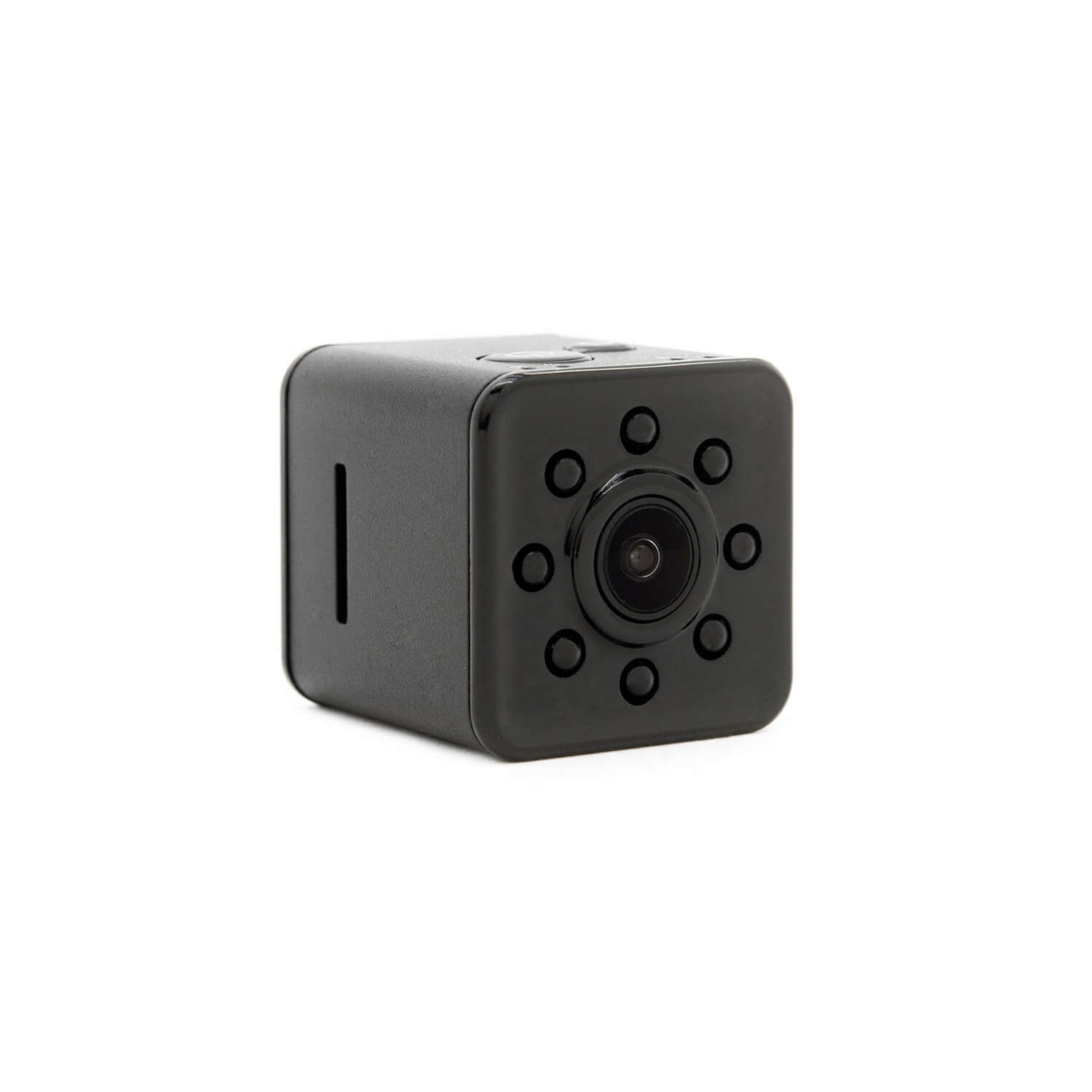 Мини видеокамера в форме кубика на подставке с шаровой опорой. Камера легко крепится к любому основанию и настраивается в нужном направлении. Восемь ИК светодиодов обеспечивают ночную съемку на расстоянии до 5 метров. Возможно использовать карту памяти Micro SD до 32 Гб с циклической записью. Встроенная литий-ионная батарея обеспечивает до 90 минут автономной работы в режиме записи.